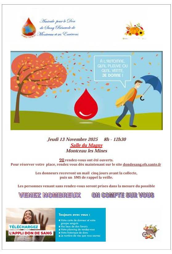 La prochaine collecte de sang aura lieu à la salle du Magny à Montceau-les-Mines, jeudi 13 novembre 2025 de 8 h à 12 h 30.