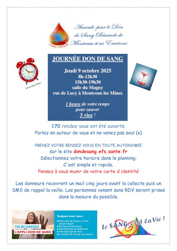 La prochaine collecte de sang aura lieu à la salle du Magny à Montceau-les-Mines jeudi 9 octobre de 8h à 12h30 et de 15h30 à 19h30.