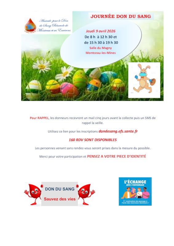 La prochaine collecte de sang aura lieu à la salle du Magny de Montceau-les-Mines le jeudi 9 avril 2026 de 8 h à 12 h 30 et de 15 h 30 à 19 h 30.