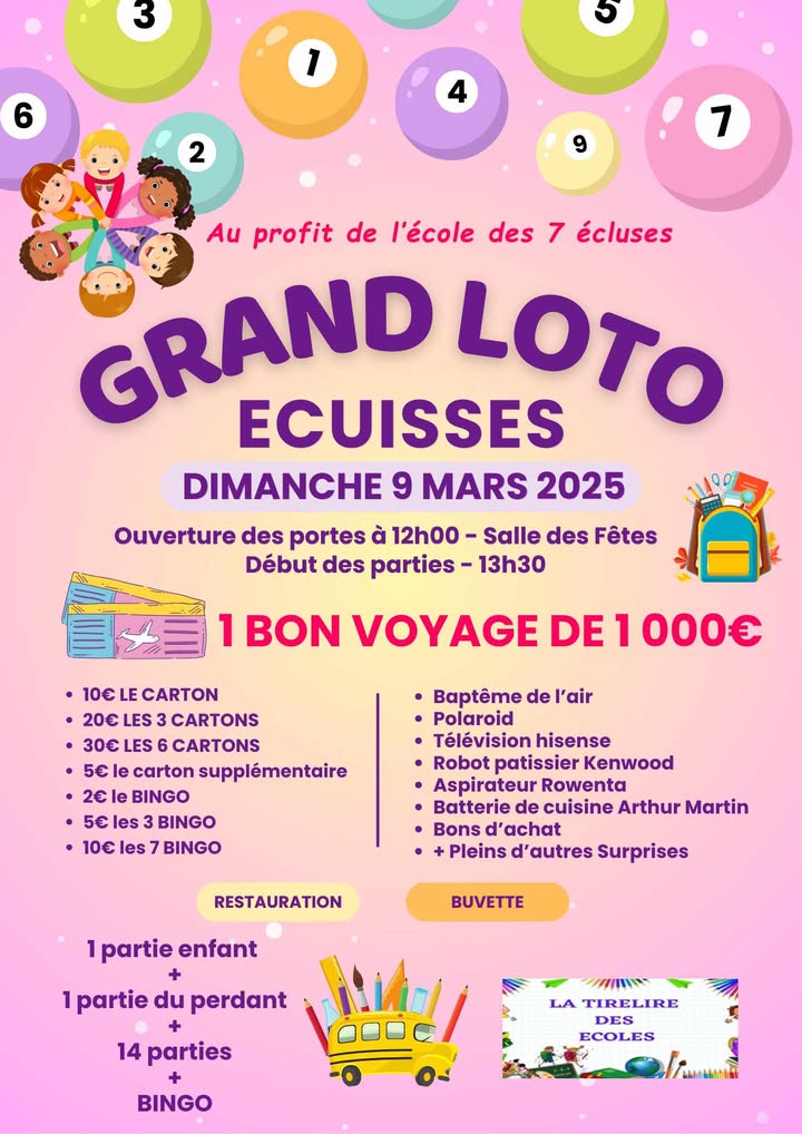 Loto de la tirelire des écoles à Écuisses dimanche 9 mars à partir de 12h à la salle des fêtes. Première partie à 13h30.
