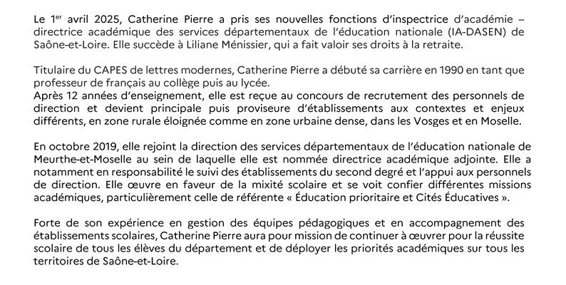 Elle remplace Liliane Ménissier qui a pris sa retraite. Catherine Pierre est la nouvelle inspectrice d’académie – directrice académique des services départementaux de l’Education nationale (IA – DASEN) de Saône-et-Loire. Lire le communiqué.