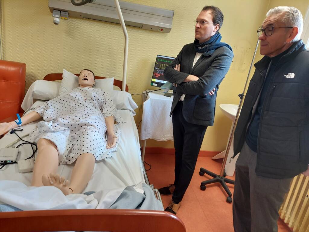 Dans les locaux de l’IFSI à l’hôpital de Montceau qui à la rentrée prochaine s’installera dans une aile rénovée du lycée Haigneré, un mannequin joue le rôle du malade. C’est n’est pas qu’un simple corps en plastique, rigide et purement accessoire, il répond aux moindres sollicitations du formateur qui grâce à une tablette informatique, est capable de simuler toute sorte de problème, même un arrêt cardiaque. « Nous mettons ainsi les étudiants de 3e année en situation dans le cadre de leur formation » explique Julien à David Marti, président de la CUCM et Jérémy Pinto, vice-président en charge de l’enseignement supérieur.
