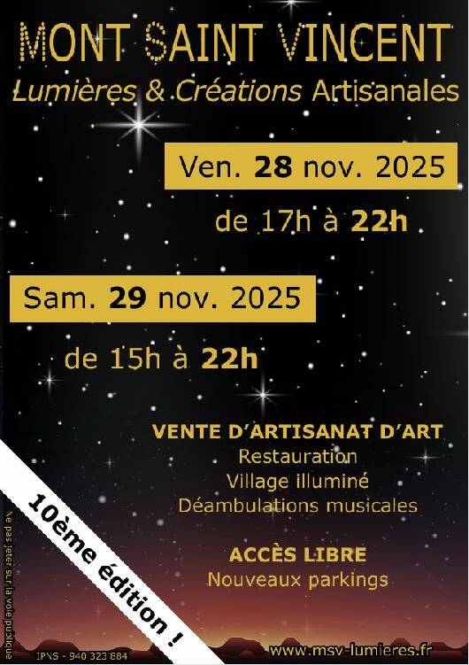 10e édition de la Fête des Lumières & Créations à Mont-Saint-Vincent : vendredi 28 novembre 17h – 22h et samedi 29 novembre 15h – 22h.