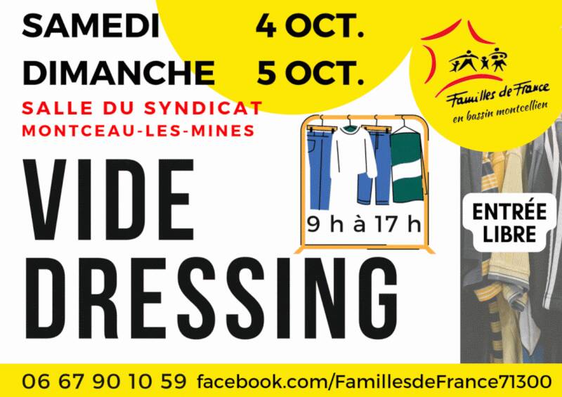 Le vide-dressing automnal de Familles de France se déroulera les 4 et 5 octobre 2025 à la salle du syndicat – 43 rue Jean Jaurès à Montceau-les-Mines.