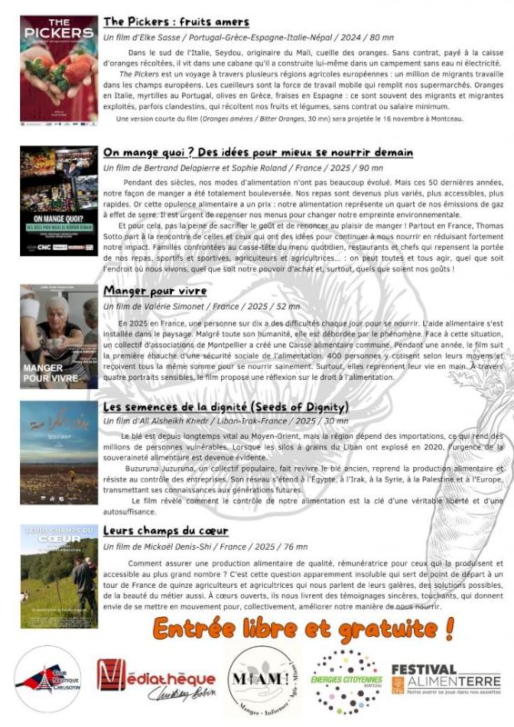 Sur le territoire du Creusot-Montceau, le collectif Miam !, qui regroupe des citoyens et des acteurs locaux désireux de promouvoir une alimentation locale, durable et de qualité pour tous, vous convie ainsi à 6 projections de films documentaires suivies d’échanges.