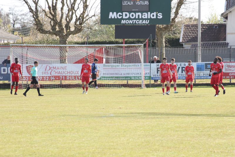 Buts pour Montceau : Pierre Clément (87e et 90 + 3); pour Selongey : Anthony Pitois (23e et 28e sp), Lenny Beauséjour (69e), Loïs Hugot (84e)