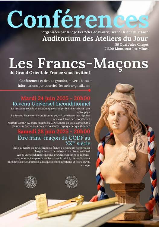 Nous vous invitons à assister aux deux conférences publiques, qui auront lieu à l’auditorium des Ateliers du Jour à Montceau-les-Mines à 20 h : Le revenu universel inconditionnel, le 24 juin, Être franc-maçon au GODF au XXIe siècle, le 28 juin.