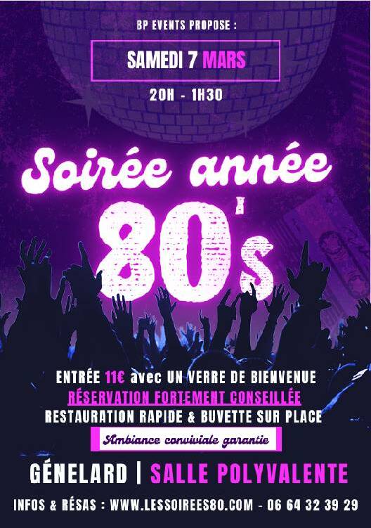 Une soirée année 80 aura lieu le 7 mars prochain à Génelard à la salle polyvalente de 20h à 1h30.