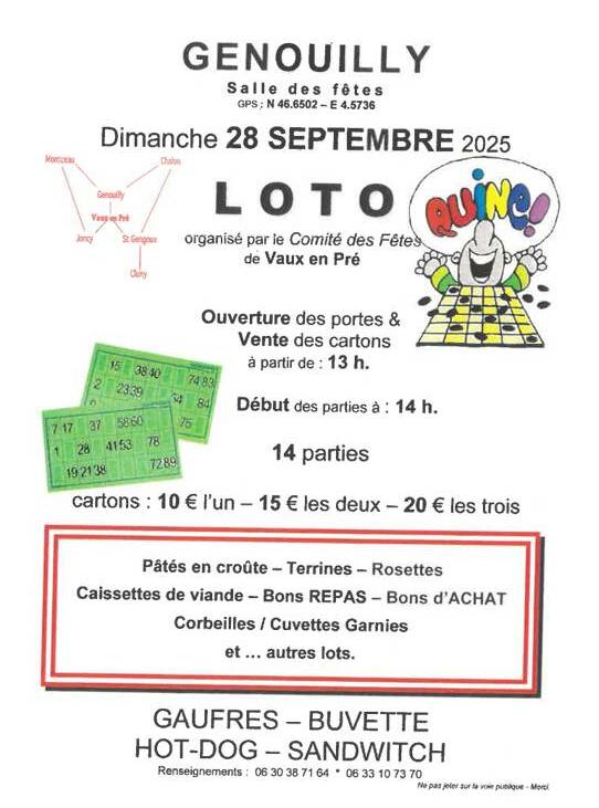 Le comité des fêtes de Vaux-en-Pré organise dimanche 28 septembre 2025, un loto à la salle des fêtes de Genouilly.