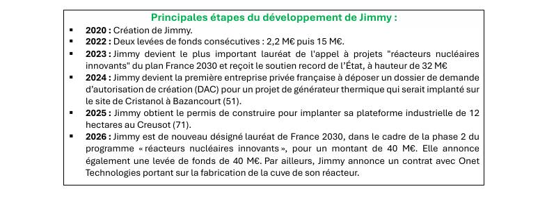 En parallèle, à l’issue d’une évaluation technique et industrielle approfondie coordonnée par le Secrétariat général pour l’investissement (SGPI), Jimmy a été désigné lauréat de la phase 2 du programme « réacteurs nucléaires innovants » de France 2030 pour un montant de 40 M€, faisant suite à un premier financement de 32 M€ obtenu en phase 1 en 2023. Cette désignation s’inscrit dans le processus enclenché en mars 2025 par le Conseil de Politique Nucléaire, sur recommandation du Haut-Commissaire à l’énergie atomique, visant à concentrer le soutien de l’État sur un nombre limité de projets parmi les treize initialement accompagnés.