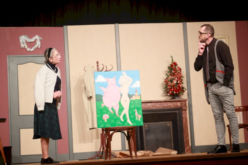 Le sens du burlesque et la performance sont bien présents sur scène. Rien ne manque. Le décor, le gilet pour descendre les poubelles, la peinture (très réaliste) de Thérèse, et clou du spectacle, le portrait du cochon, plus vrai que nature.