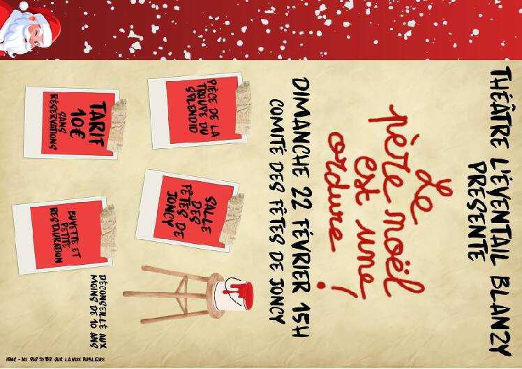 Ne manquez pas le rendez-vous proposé par le comité des fêtes de Joncy, dimanche 22 février 2026 à 15h. A la salle des fêtes, la troupe théâtrale L’Eventail de Blanzy aura l’immense plaisir de jouer « Le père Noël est une ordure ».