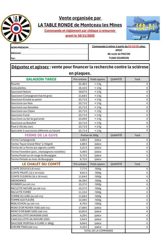La Table Ronde 134 de Montceau-les-Mines organise une vente solidaire de produits locaux : charcuterie, fromages et terrines. Les bénéfices de cette opération seront reversés à une association locale engagée dans la lutte contre la sclérose en plaques.