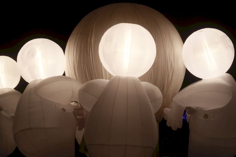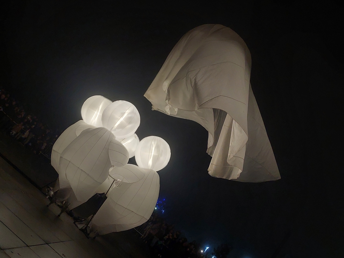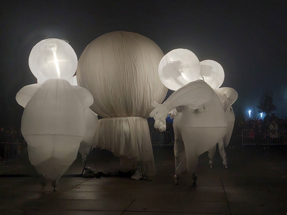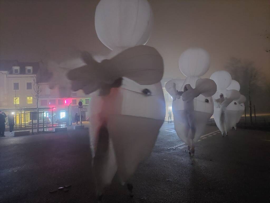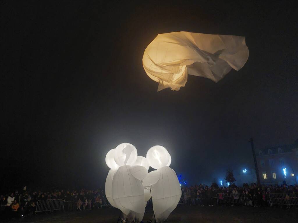 Au milieu de cet écrin apaisé, des créatures d’un blanc immaculé surgies des entrailles de la terre, se sont dressées, mystérieuses et bienveillantes. Elles éclairent, veillent, invitent au rêve. Une danse en noir et blanc s’est alors engagée, subtilement dirigée par la vasque lunaire qui domine la place et diffuse une lumière douce, presque céleste.