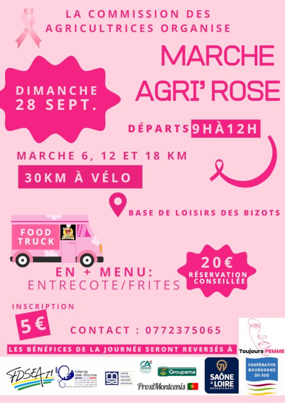 On commence dimanche 28 septembre aux Bizots par la marche Agri’rose organisée par la commission des agricultrices. Rendez-vous à la base de loisirs (voir l’affiche ci-dessous).