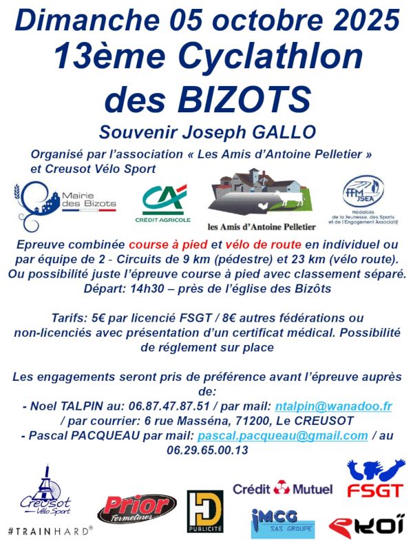 Ensuite, le 5 octobre, on change de décor et de style avec de la course à pied et du vélo pour la 13e édition du Cyclathlon, une manifestation organisée par 3les amis d’Antoine Pelletier » et Creusot Vélo Club (voir l’affiche également ci-dessous) :
