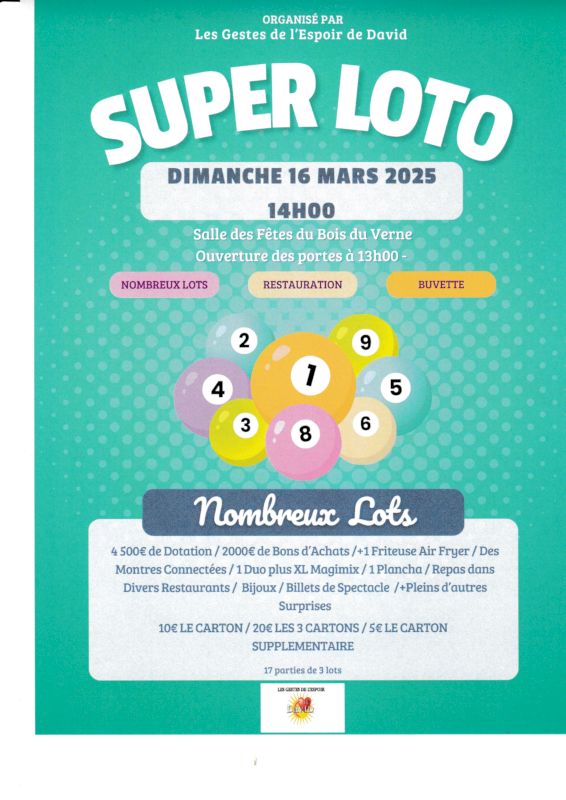 L’association Les gestes de l’espoir de David organise son loto dimanche 16 mars 2025 à partir de 14h à la salle des fêtes du Bois du Verne à Montceau-les-Mines.