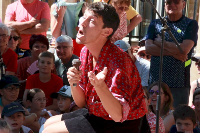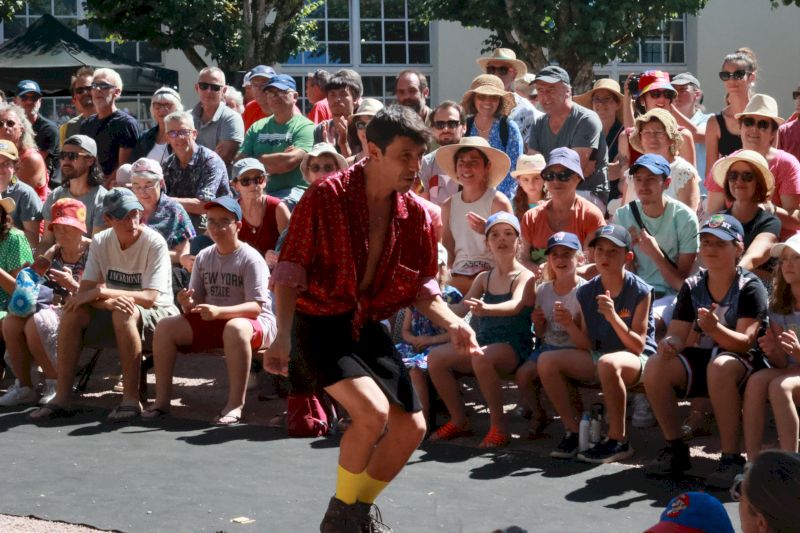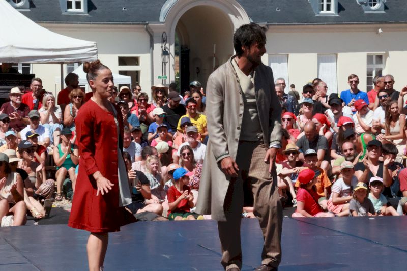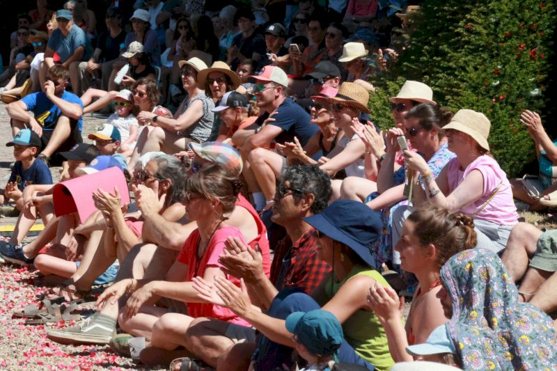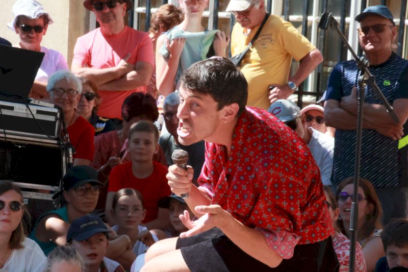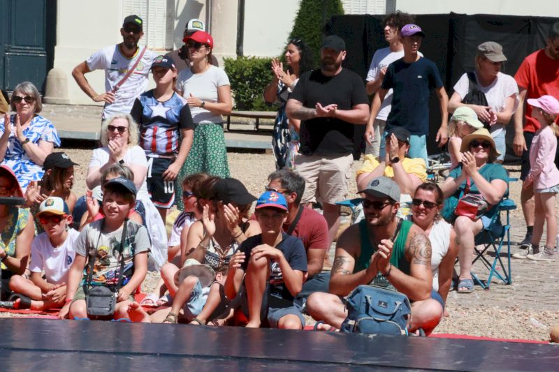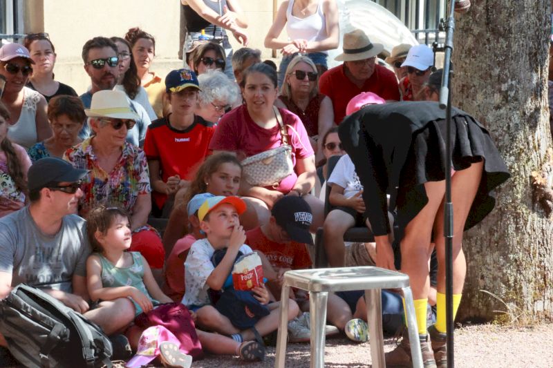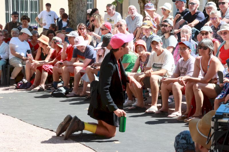 Malgré la chaleur écrasante de ce samedi après-midi, le public est au rendez-vous, nombreux, curieux, enthousiaste. On s’émerveille devant “Time to Loop”, performance de cirque acrobatique hypnotique, on sourit, on vibre avec Valentin Dilas dans Playback FM, qui endosse jupe et verbe avec panache et tendresse, enfin presque toujours.