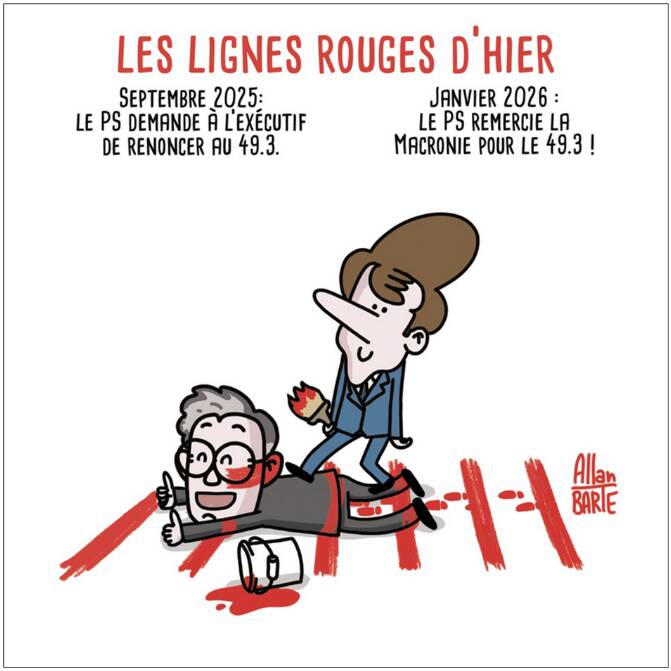 Aux camarades n’ayant pas renié le NFP nous interrogeons : Comment pouvez-vous faire le choix de vous allier avec de telles girouettes, qui changent de position à chaque nouveau chantage du gouvernement ? Comme nous, vous n’avez pas honte de toutes ces « lignes rouges » décrétées et aussitôt enjambées les unes après les autres sans conviction (un 1er ministre issu du NFP, un 1er ministre de gauche, une abrogation de la réforme des retraites, une taxe Zucman, une toute petite taxe Zucman « light » svp, pas de 49.3, etc.) ? Il en va de la confiance accordée à la parole publique.