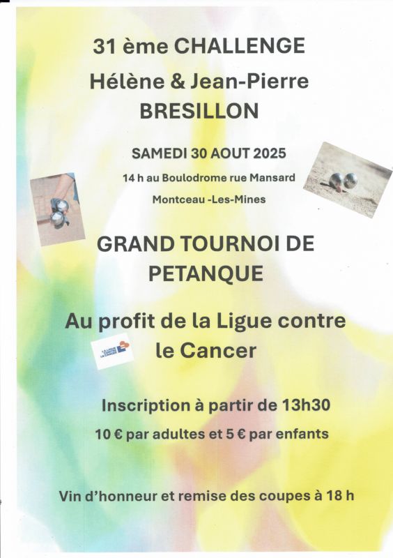 31ème challenge de pétanque « Hélène et Jean-Pierre Brésillon » le 30 août 2025 à 14h au boulodrome de Montceau-Les-Mines.