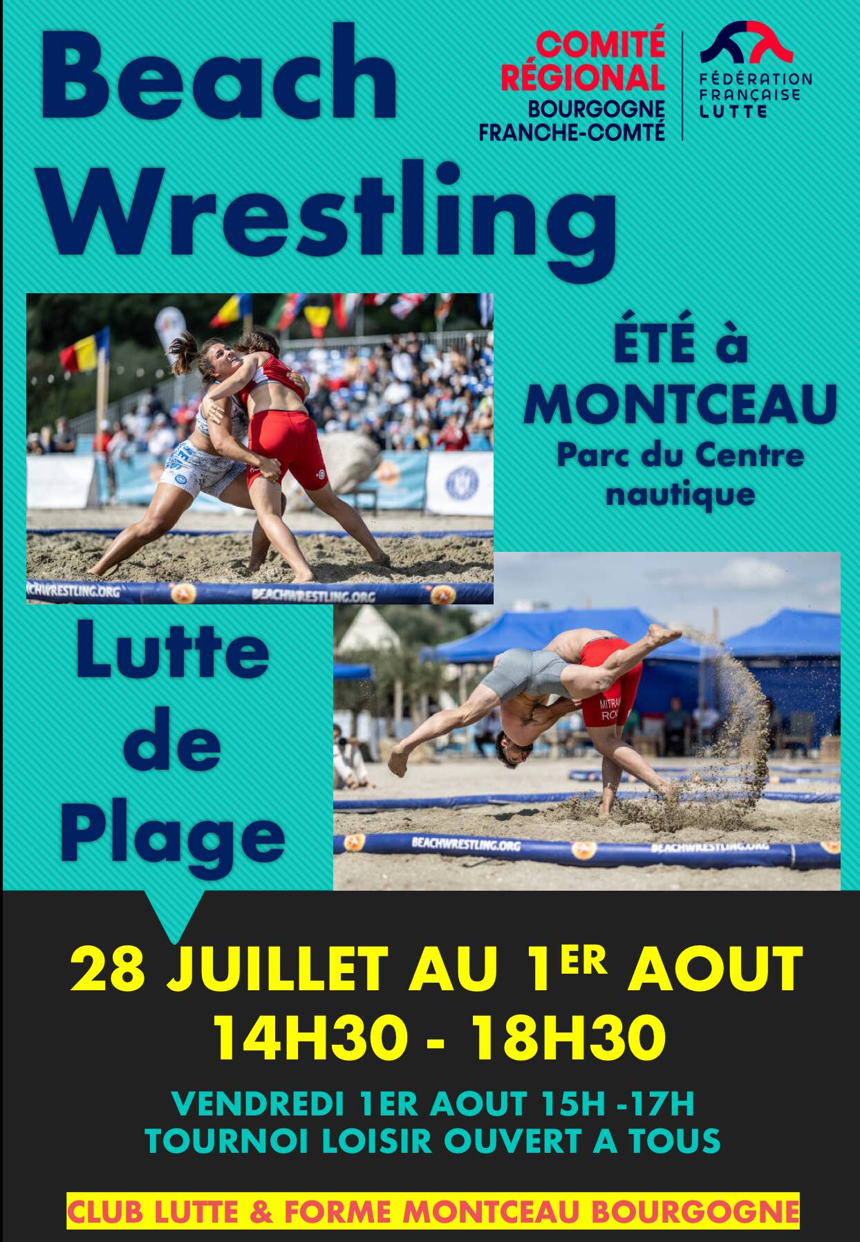 Dans le cadre de l’Été à Montceau, le club de lutte sera présent au Parc du Centre nautique du 28 juillet au 1er aout, de 14h30 à 18h30, pour la découverte et la pratique de la lutte de plage, discipline estivale développée par la fédération internationale depuis une dizaine d’années.