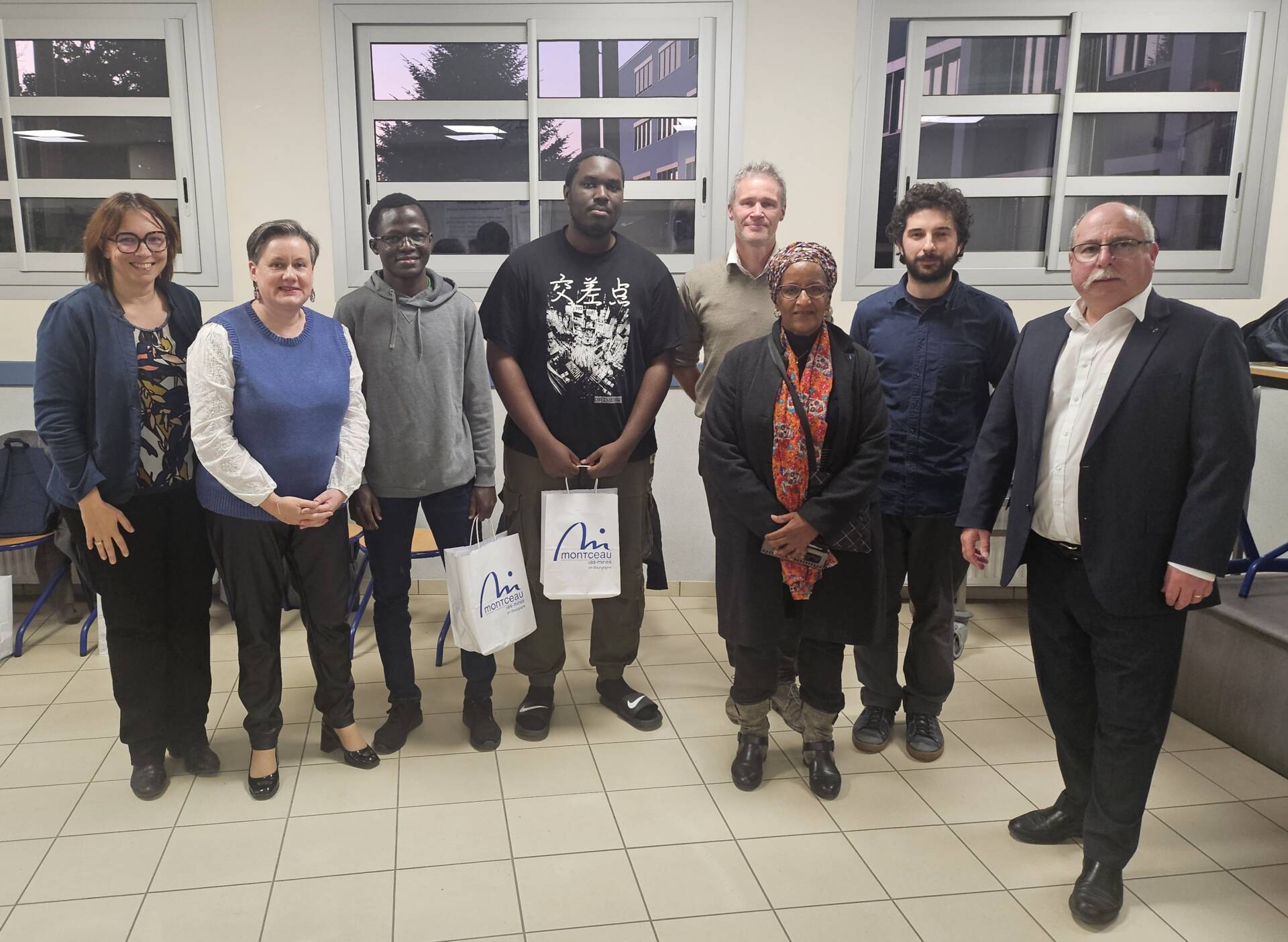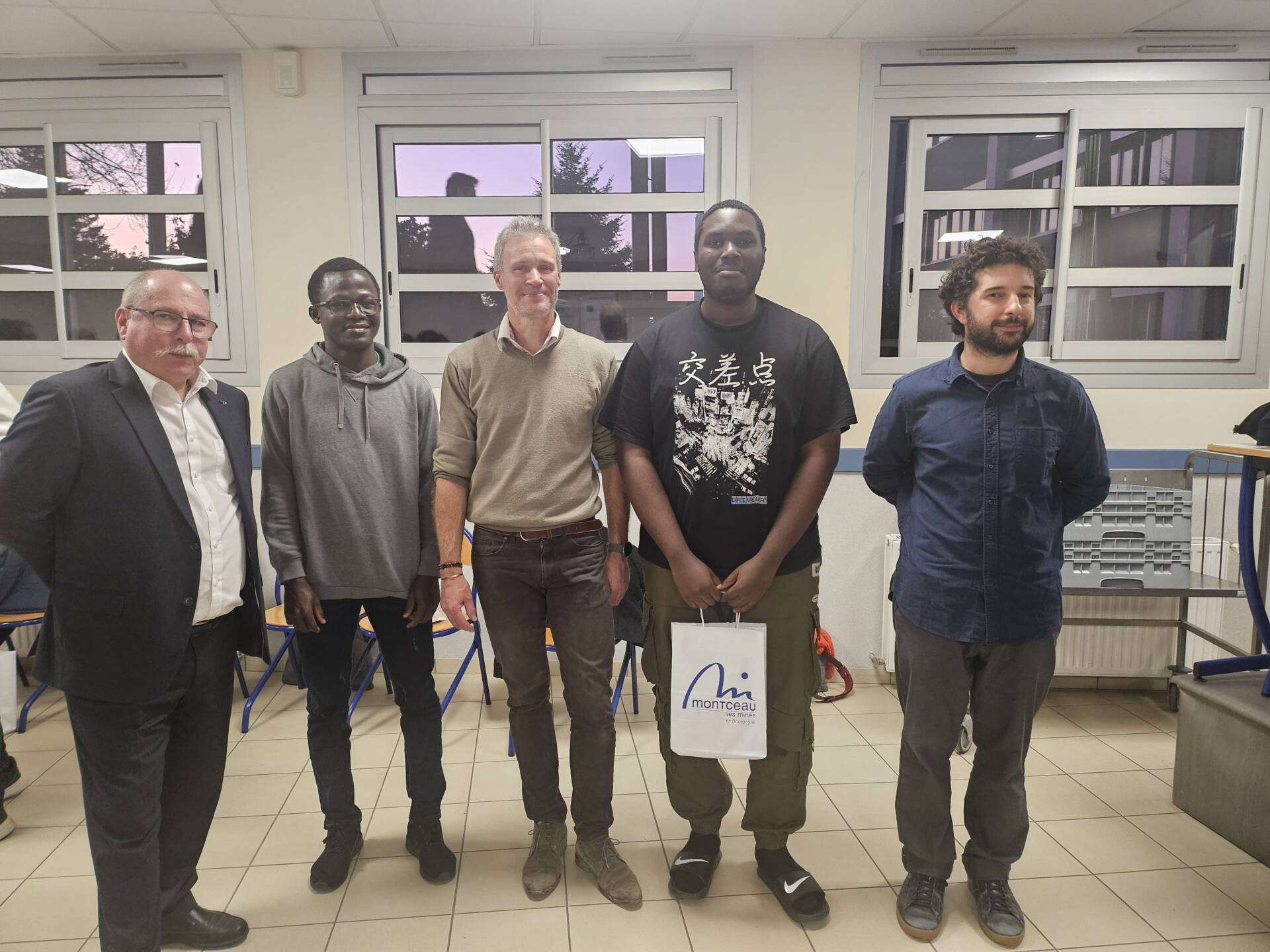 Sur la photo: Pascal Vilette, proviseur; Mickaël Maazoun, professeur; Grégory Desanlis, professeur et tuteur des polytechniciens; Christiane Mathos, conseillère déléguée aux cultures partagées de Montceau-les-Mines; Olivier Hounhozounkou; Arthur Edzoa; Christelle Roux-Amrane, maire-adjointe de Montceau-les-Mines et présidente d’Info Jeunes Saône-et-Loire; Séverine Ciron, directrice du Pôle Education, Enfance, Jeunesse de Montceau-les-Mines.