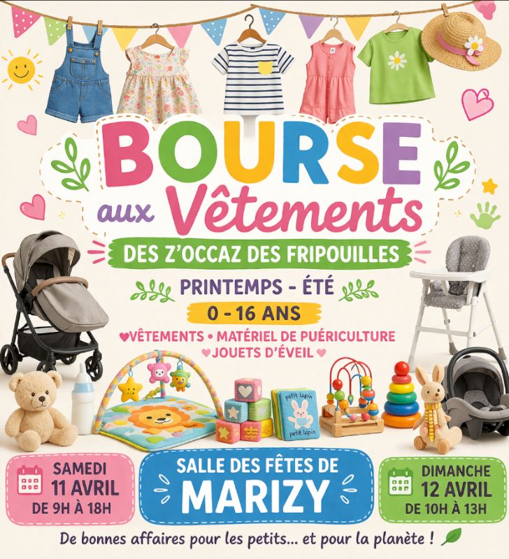 L’association les Z’occaz’ des fripouilles organise ce samedi 11 et dimanche 12 avril 2026 sa bourse aux vêtements printemps – été de 0 à 6 ans, matériel de puériculture et jouets d’éveil.