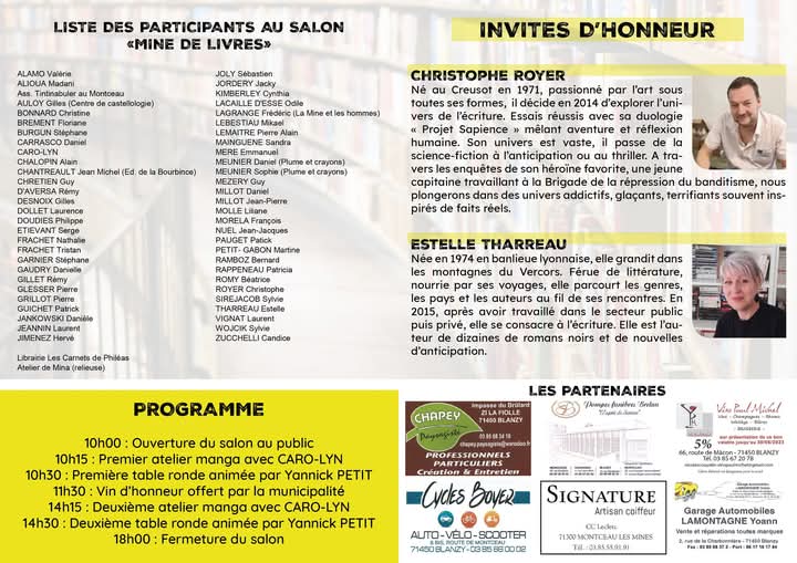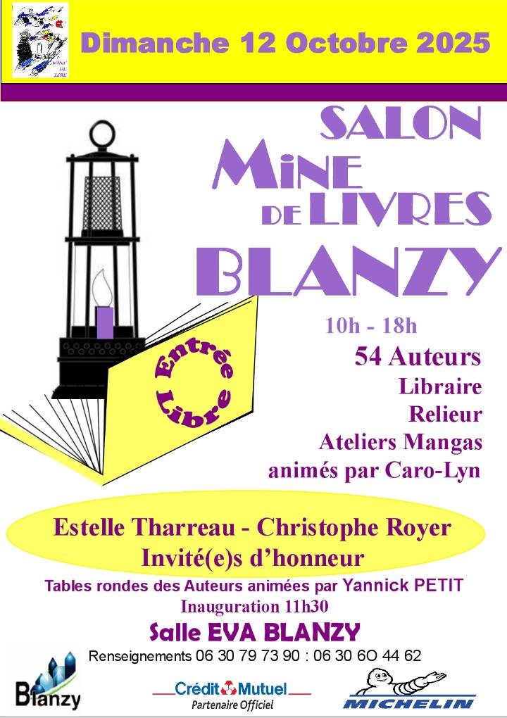 L’association Mine de lire organise le salon Mine de livres, dimanche 12 octobre 2025 à l’EVA de Blanzy de 10h à 18h avec pour invités d’honneur, Estelle Tharreau et le régional de l’étape qu’on ne présente plus, Christophe Royer.