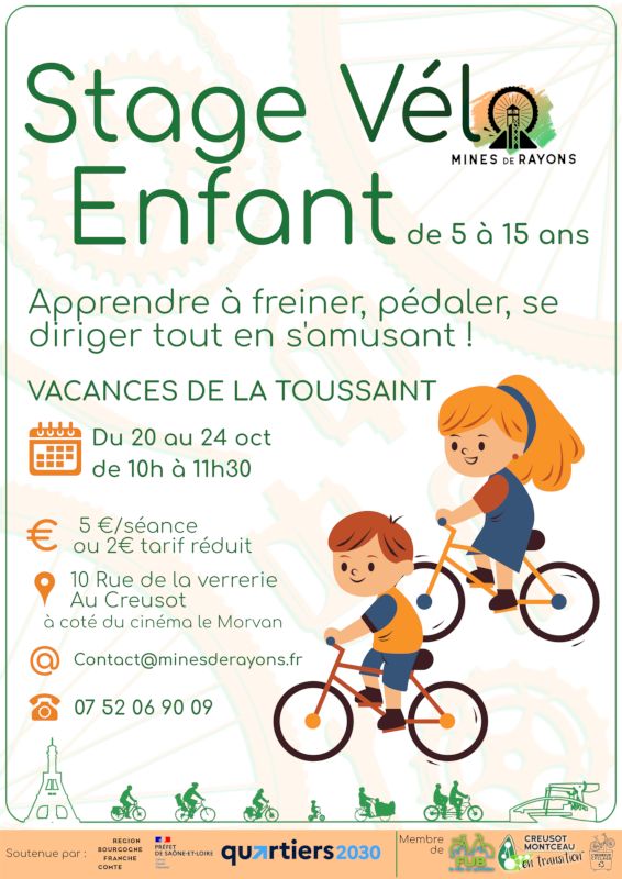 L’association Mines de rayons organise un stage vélo enfants : du 20 au 24 octobre 2025, de 10h à 11h30, pour les enfants de 5 à 15 ans (1ère semaine des vacances de la Toussaint).