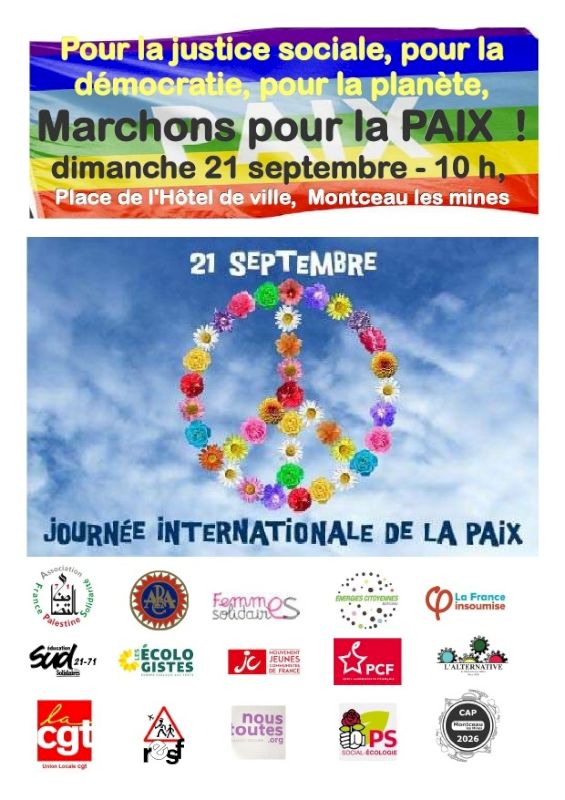 En conséquence, nous appelons l’ensemble de la population à agir et à participer le dimanche 21 septembre à une Marche pour la PAIX, qui partira de la place de l’Hôtel de Ville à Montceau les mines à 10 h.