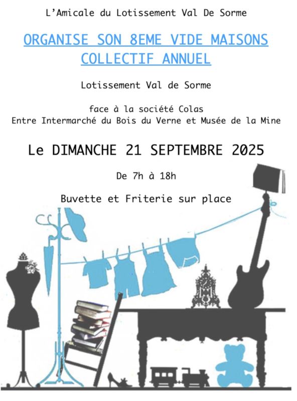 L’amicale du Val de Sorme organise son 8e vide-maisons le dimanche 21 septembre 2025 pour les habitants de son quartier. Une trentaine d’exposants accueilleront les nombreux chineurs sur leur propriété dans les rues Pompidou, Fleming, Luther King, Harnes et Petite Sorme entre 7h et 18h.