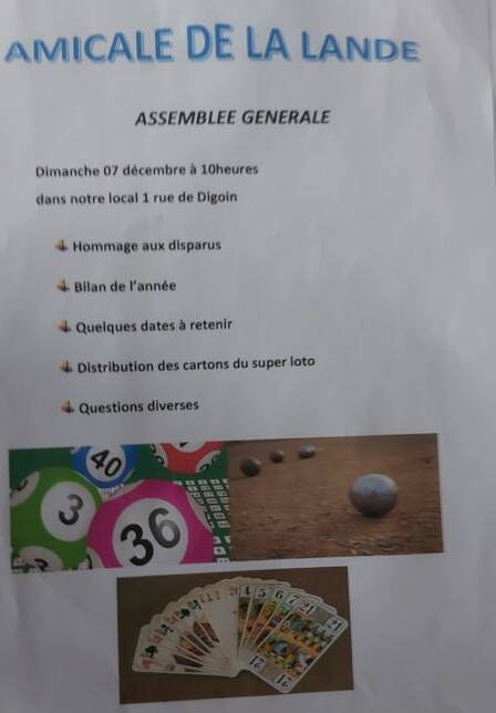 L’Amicale de la Lande tiendra son assemblée générale, dimanche 7 décembre 2025 à 10 h au local 1 rue de Digoin à Montceau-les-Mines.