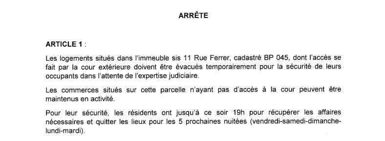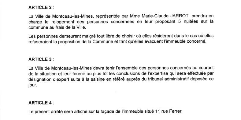 Suite au rapport de la société Antea France, envoyé par courriel le 29 janvier à 23 h 18, la ville de Montceau a pris des mesures d’urgence, à savoir : l’interdiction formelle faite aux locataires d’emprunter la coursive située au 11, rue Ferrer, pour rejoindre leurs appartements. Ils ont dû quitter les lieux avant 19 heures ce vendredi 30 janvier.
