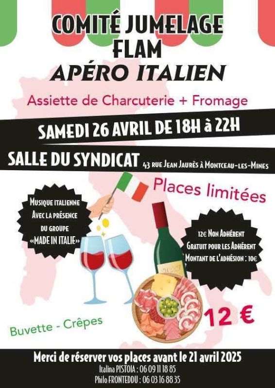 Avec le comité de jumelage FLAM (Firmo-Lungro-Acquaformosa-Montceau), la Calabre vient chatouiller les papilles des Montcelliens à l’occasion de l’apéro italien, samedi 26 avril 2025 de 18h à 22h au syndicat des mineurs à Montceau-les-Mines.