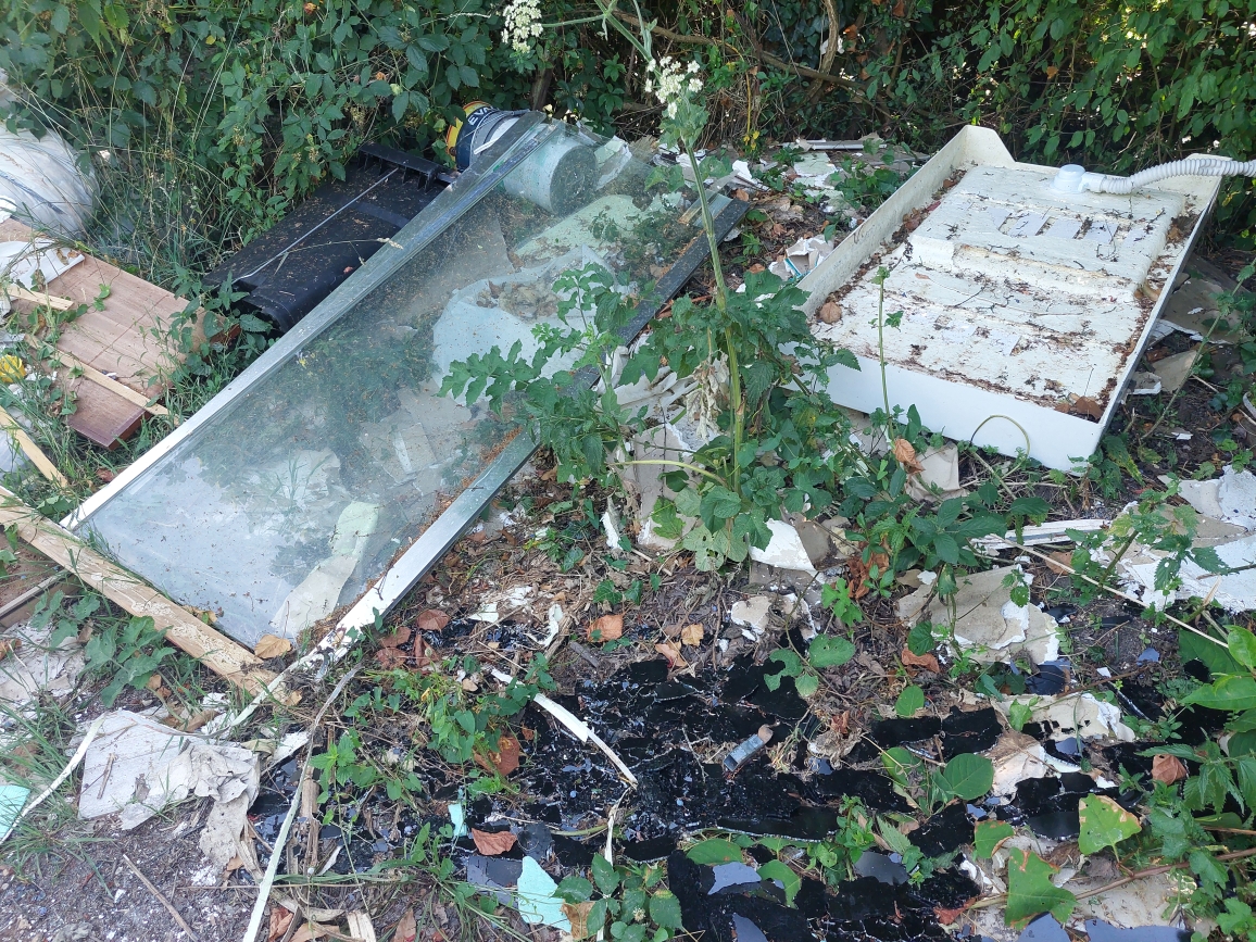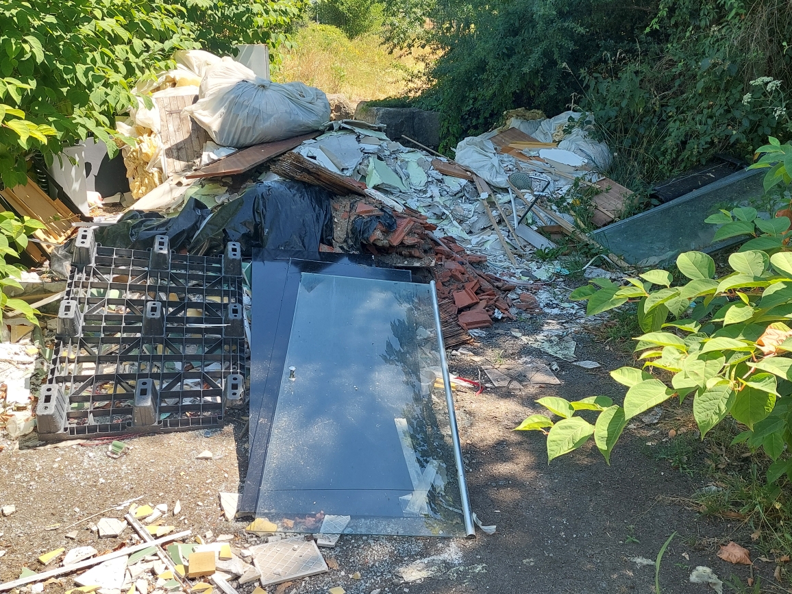 Nous sommes juste derrière le stade du Magny et à proximité des Jardins du coeur au Magny. Au sol, des tuiles, du placo, des baies vitrées, un pommeau de douche, un vieux frigo.