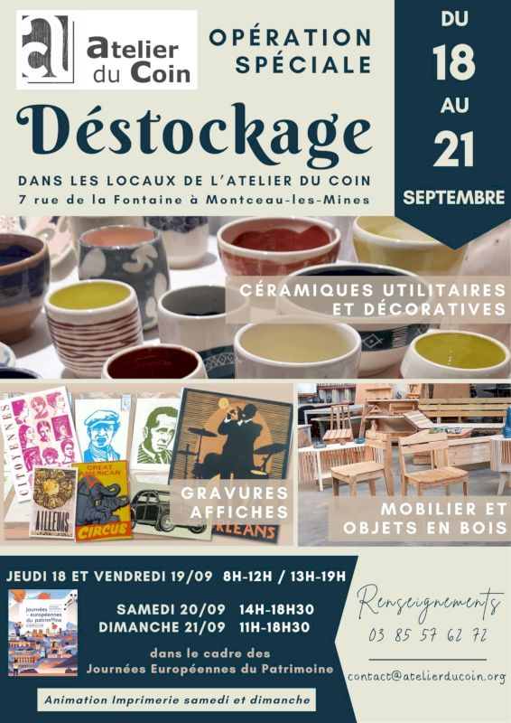 Journées Destockage à l’Atelier du Coin de 18 au 21 septembre 2025 inclus.