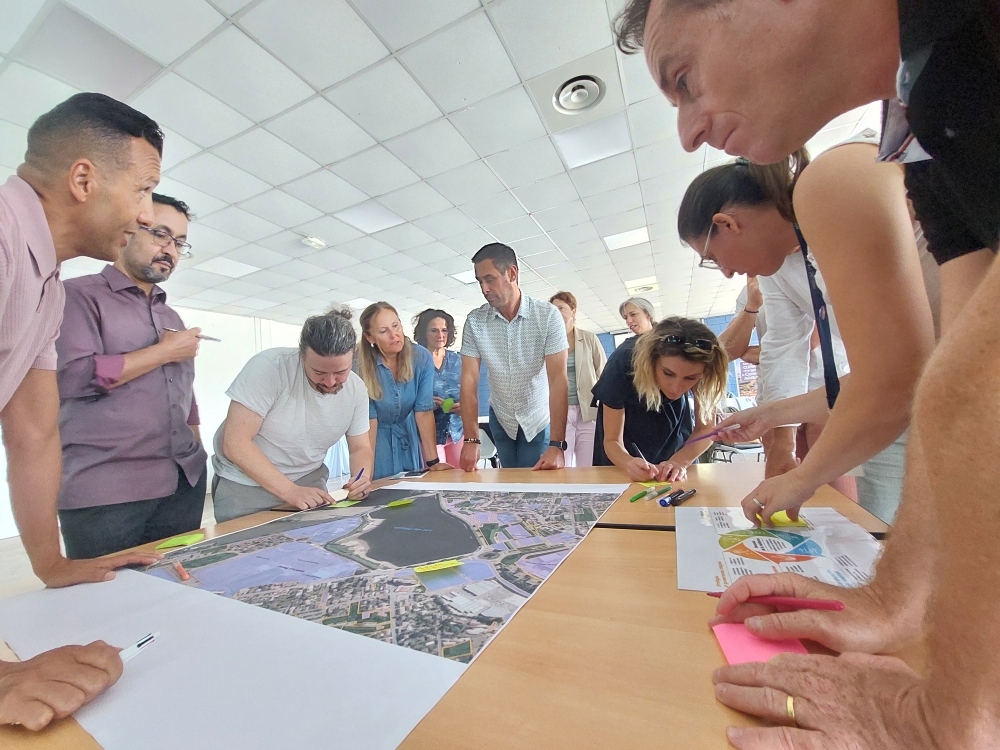 L’atelier a débuté par une visite de terrain autour du plan d’eau, visant à établir un diagnostic partagé et à alimenter les réflexions collectives. Les échanges ont permis de définir les grandes lignes d’une stratégie d’intervention, fondée sur une approche systémique intégrant les dimensions hydrologique, écologique, urbaine et sociale.