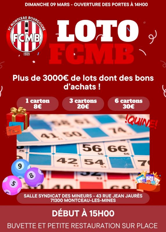 ceci dit, le loto du FC MONTCEAU BOURGOGNE aura lieu ce dimanche 9 mars 2025 à la salle syndicat des mineurs à 15h (ouverture des portes à 14h).