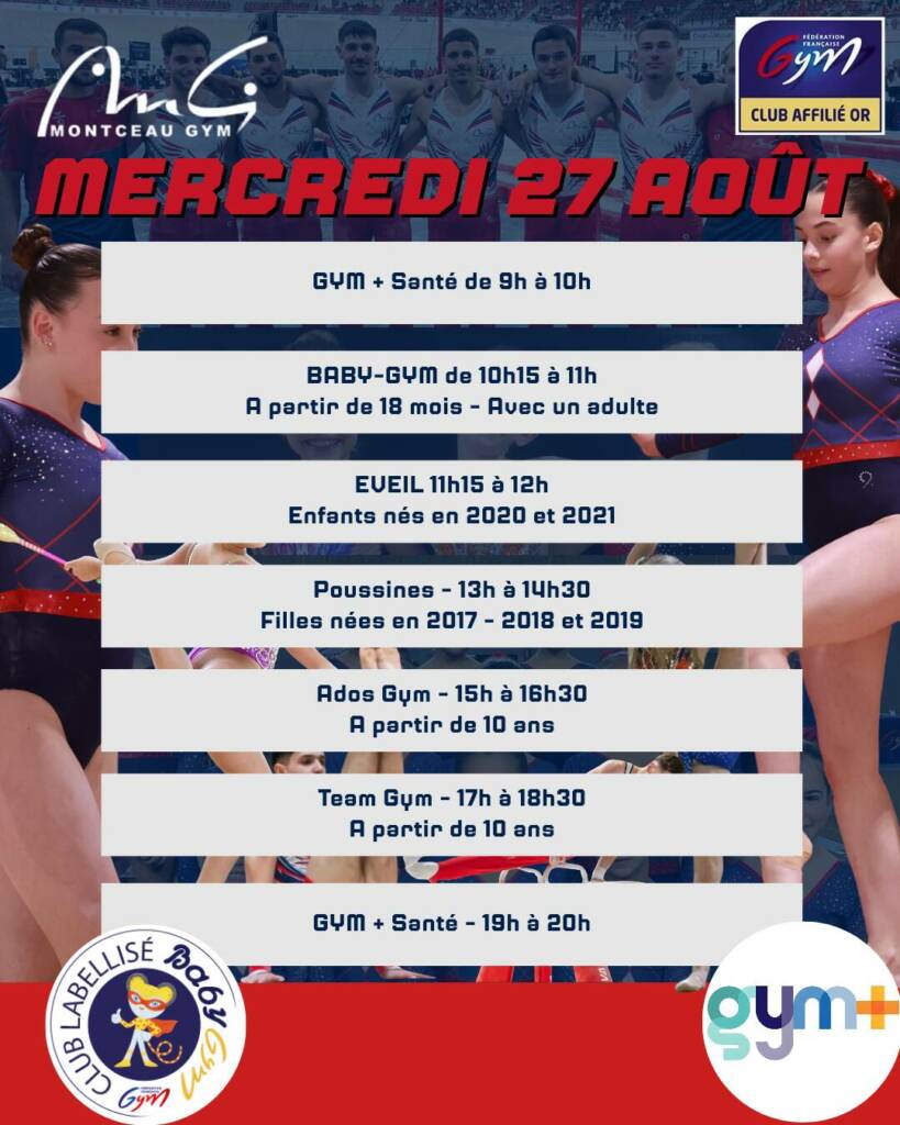 Enfin, toutes les activités reprendront – selon le planning annuel – dès la première semaine de septembre à l’exception des activités proposées pour la Petite Enfance: Baby-Gym et Eveil ( reprise la semaine du 08 Septembre).