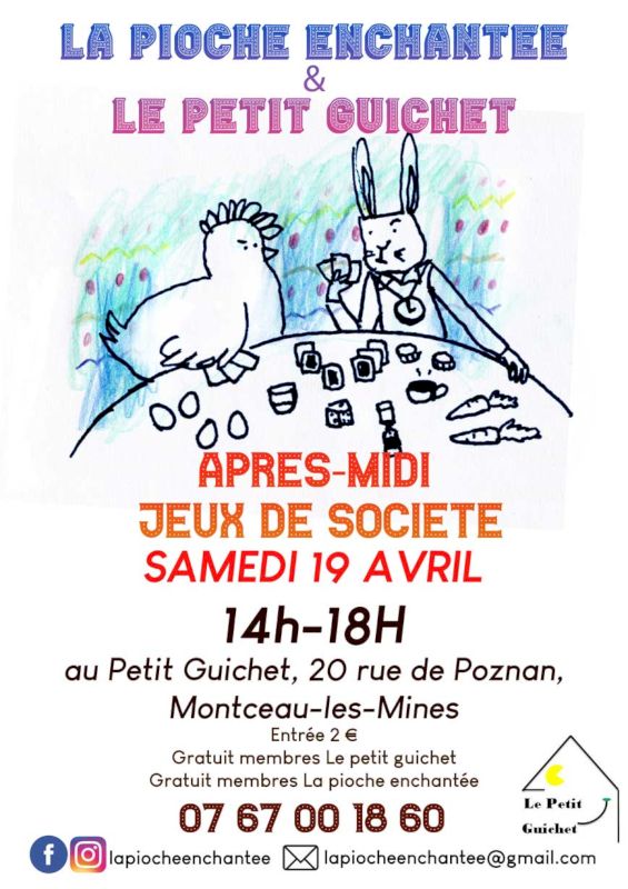 Au Petit Guichet, 20 rue de Poznan à Montceau-les-Mines avec la participation de La Pioche Enchantée, le samedi après-midi 19 avril 2025, de 14h à 18h, sera réservé aux jeux de société.