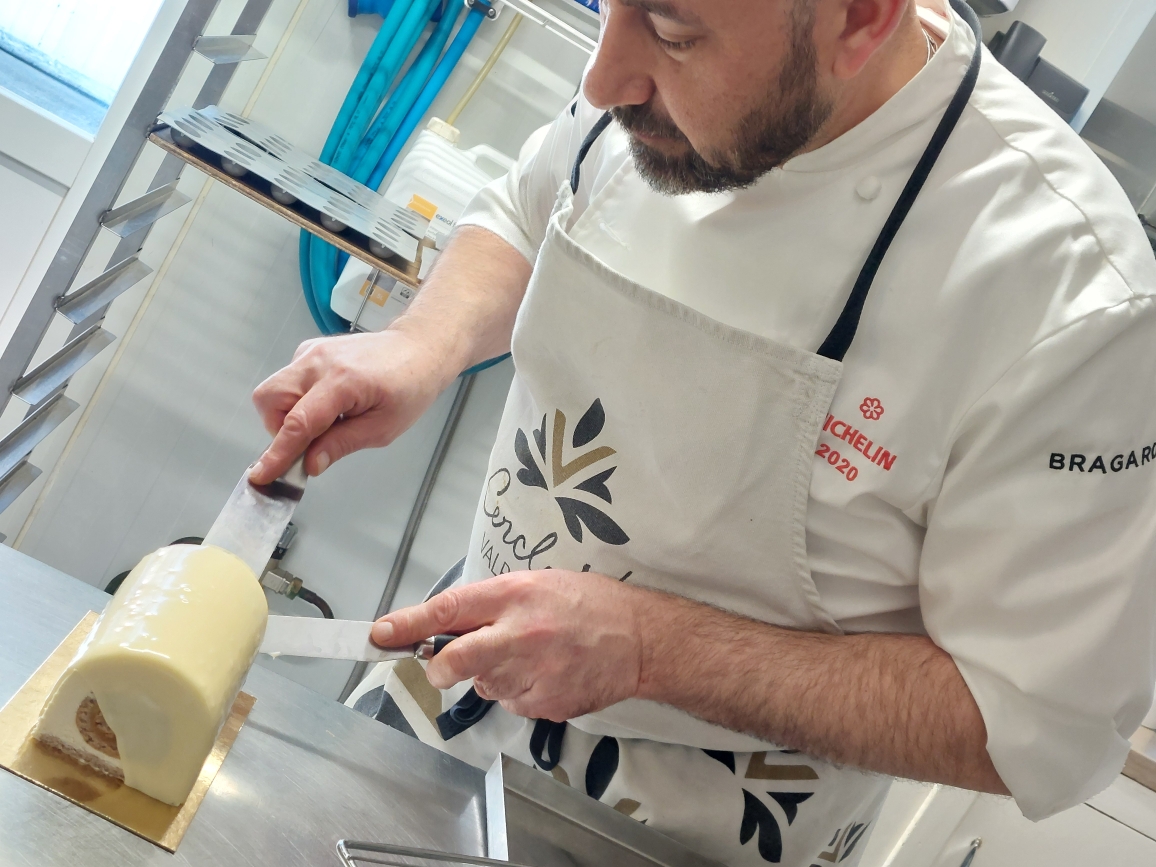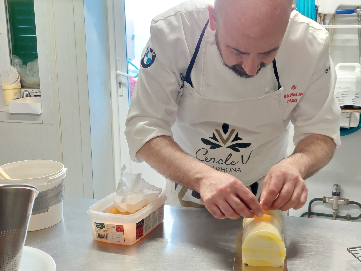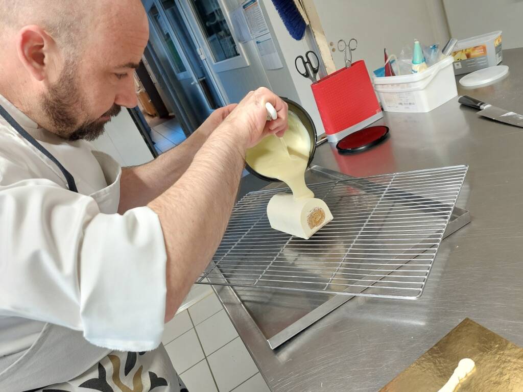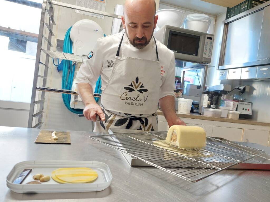 Ce jour-là, le chef prépare une bûche Turino : biscuit dacquoise au marron, marmelade de clémentines, mousse ivoire et crémeux aux marrons. D’ici quelques jours, Charles Gros et son bras droit, Cédric, auront façonné près de 100 mètres de bûche, de quoi régaler jusqu’au jour de l’An. Ensuite, place à la galette.