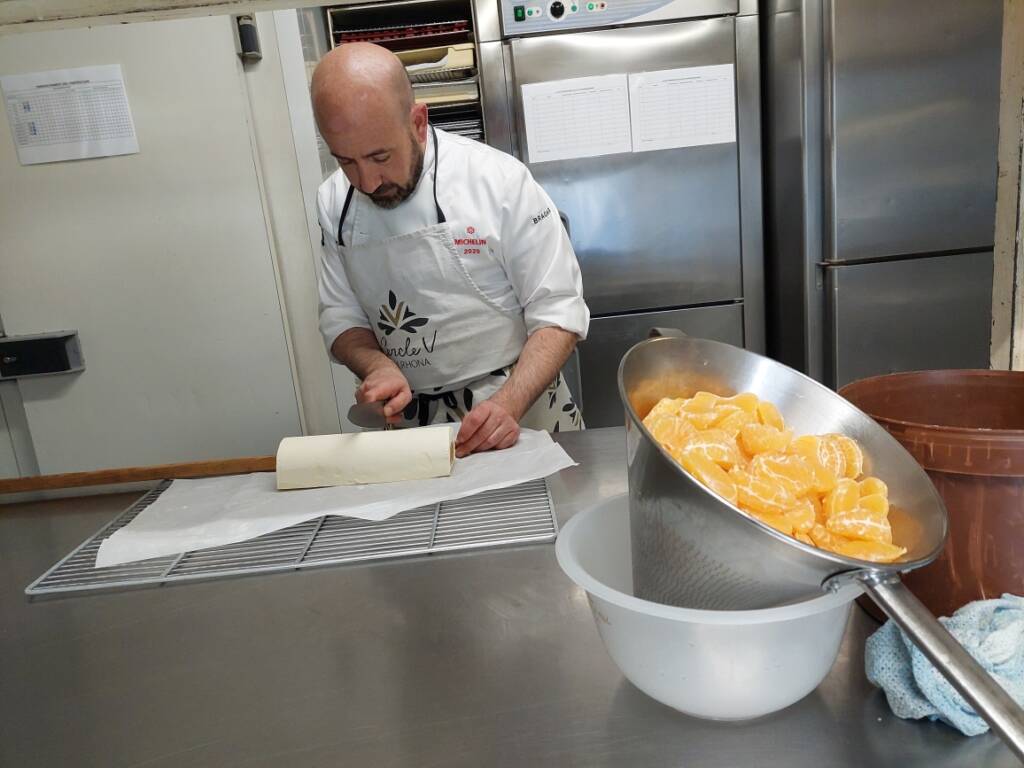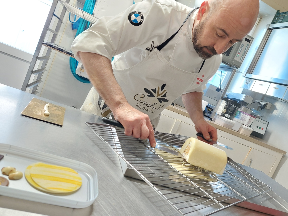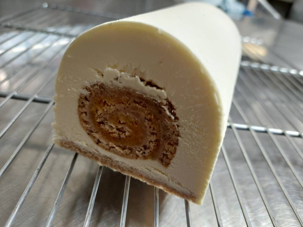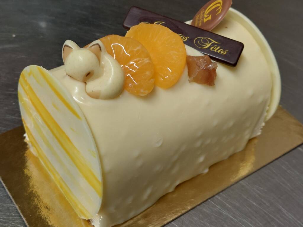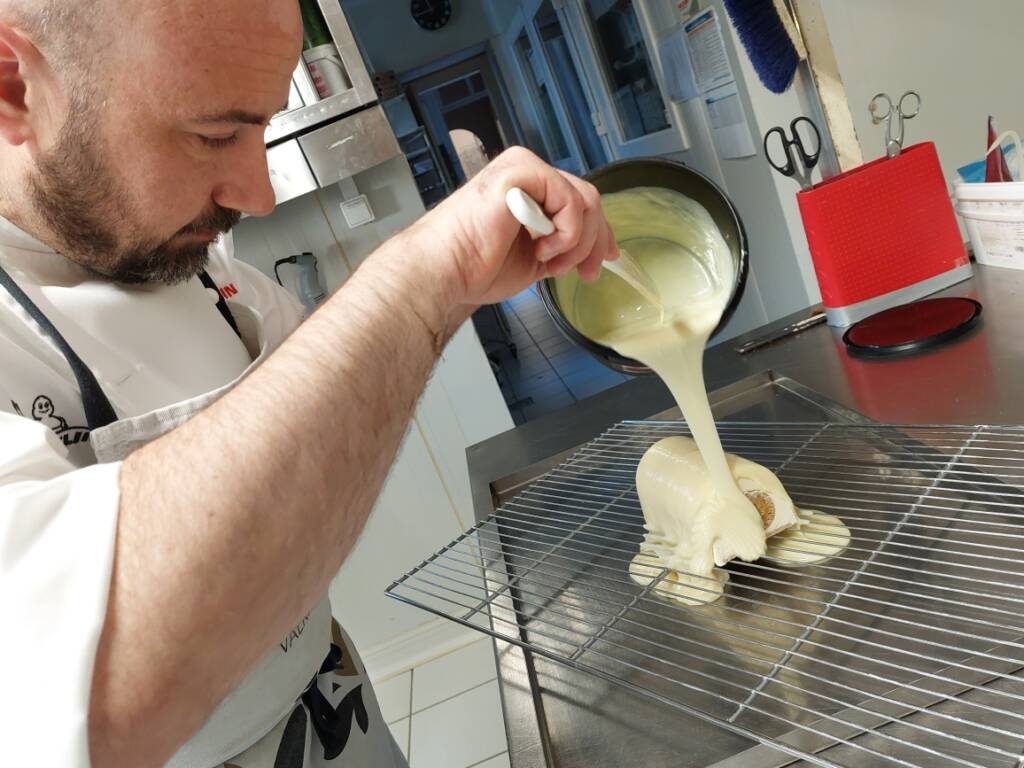 Ce jour-là, le chef prépare une bûche Turino : biscuit dacquoise au marron, marmelade de clémentines, mousse ivoire et crémeux aux marrons. D’ici quelques jours, Charles Gros et son bras droit, Cédric, auront façonné près de 100 mètres de bûche, de quoi régaler jusqu’au jour de l’An. Ensuite, place à la galette.