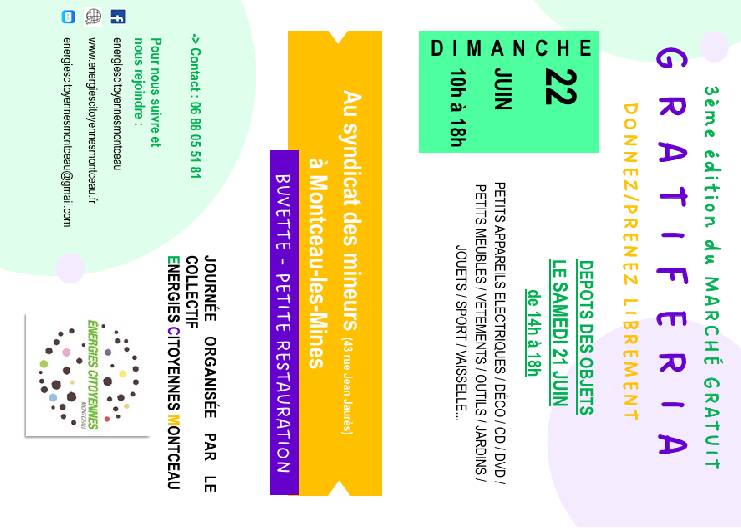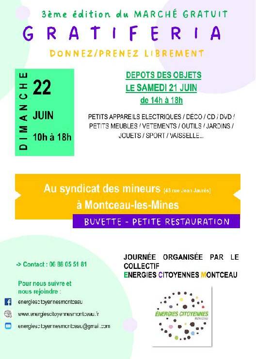 3ème édition du marché gratuit « Gratiferia » organisé par l’association Energies Citoyennes, les samedi 21 (dépôt des objets) et dimanche 22 juin 2025 au Syndicat des mineurs de Montceau-les-Mines.
