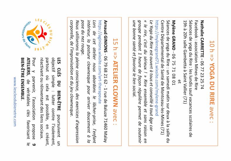 Mylène Grand est animatrice certifiée de l’Institut français du yoga du rire depuis 2016 et anime des séances, notamment au centre départemental de santé de Montceau les Mines un samedi sur deux de 10h30 à 11h30.