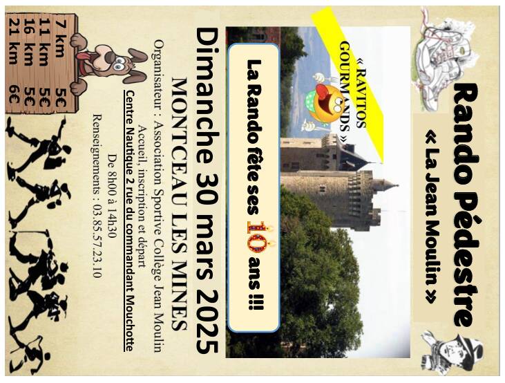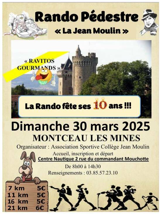 L’association sportive du collège Jean Moulin de Montceau-les-Mines, organise sa randonnée annuelle qui aura lieu cette année le dimanche 30 mars 2025 et qui fêtera par la même occasion ses 10 ans !