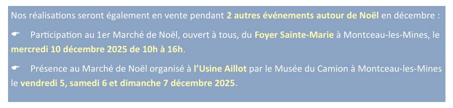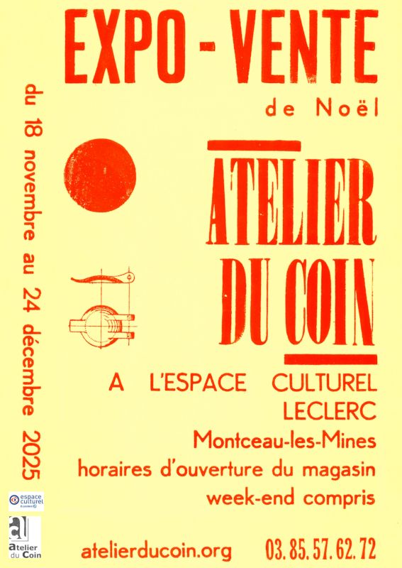 Communiqué – L’Atelier du Coin organise sa traditionnelle expo-vente de Noël, qui aura lieu du mardi 18 novembre 2025 au mercredi 24 décembre 2025 dans le hall de l’Espace Culturel E.Leclerc de Montceau-les-Mines.