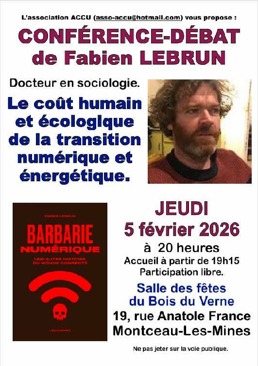 Le thème de sa conférence portera sur : le coût humain et écologique de la transition numérique et énergétique en lien avec son dernier ouvrage : « Barbarie Numérique : une autre histoire du monde connecté ».