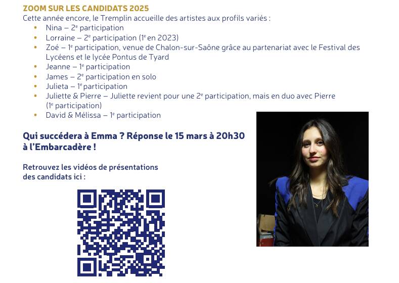 Ils étaient quinze au départ à l’heure des auditions, ils ne furent plus que huit depuis un soir d’octobre 2024. Huit candidats qui le 15 mars 2025, sur la scène de l’Embarcadère vont tenter de succéder à Emma qui a remporté l’édition 2024 du Tremplin Jeunes Talents. Considérant les duos, ils seront dix.