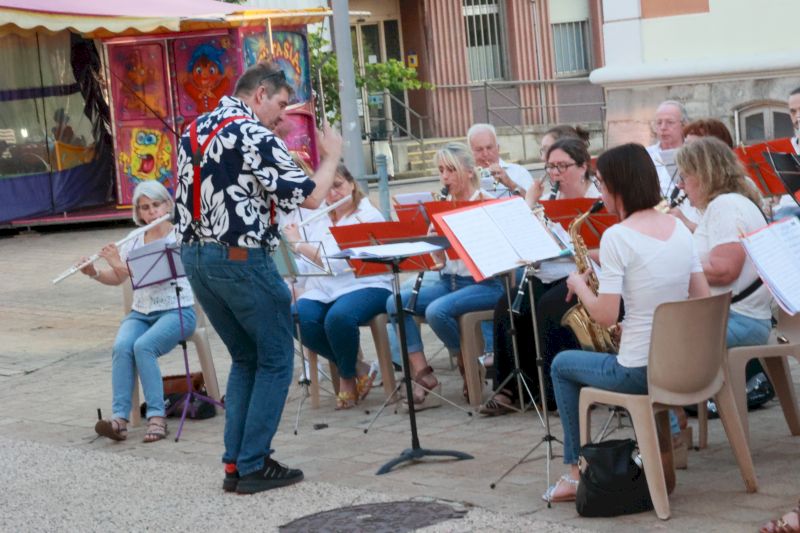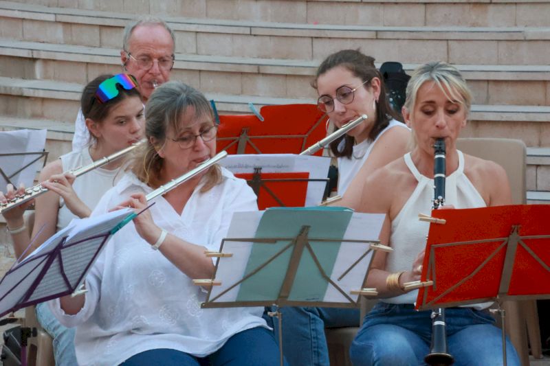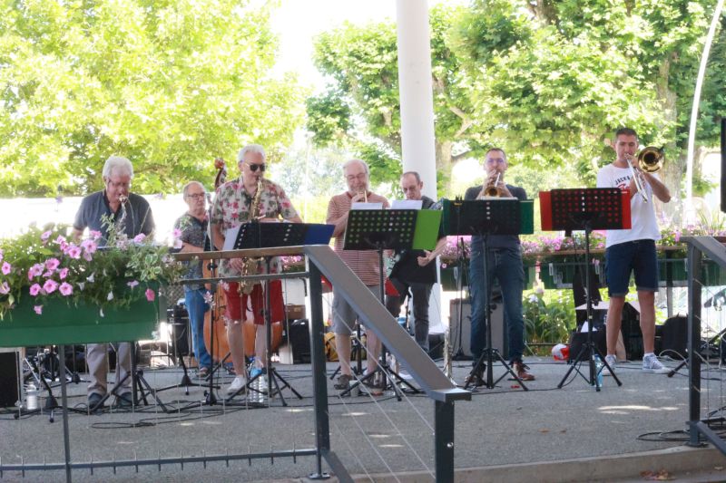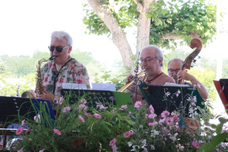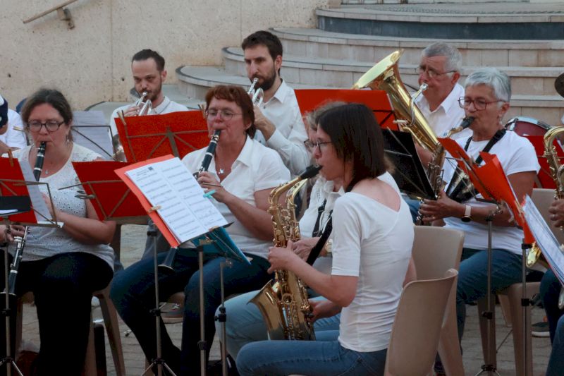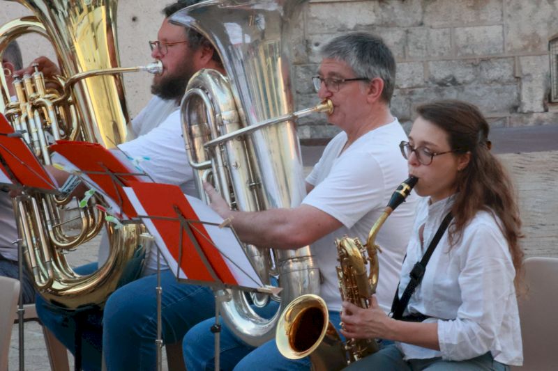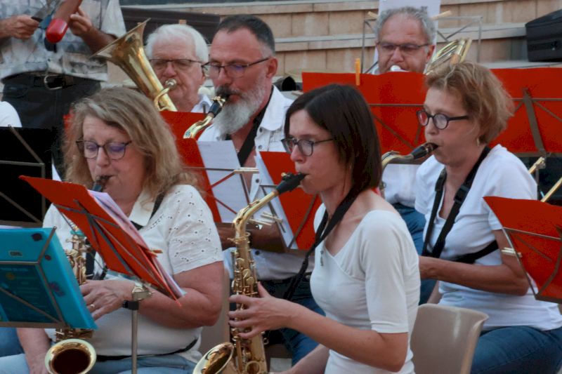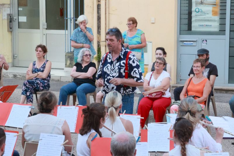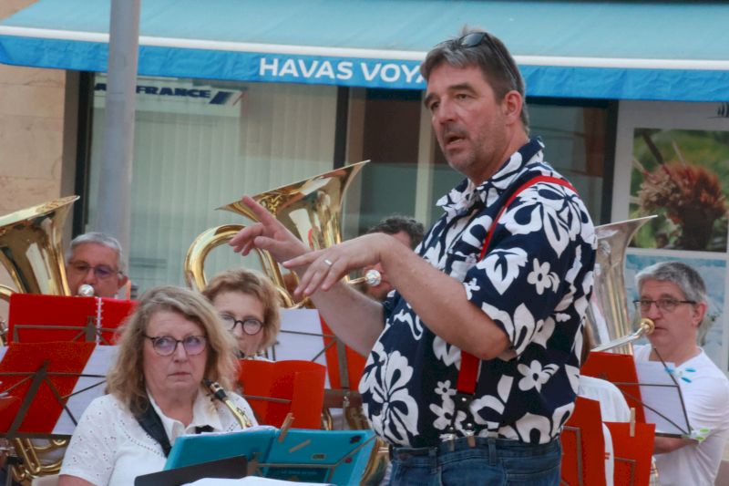 L’harmonie municipale, en rang serré, en souffle uni, dirigée d’un geste vif par Vincent Dumangin, le chef aux bretelles rouges comme une signature.