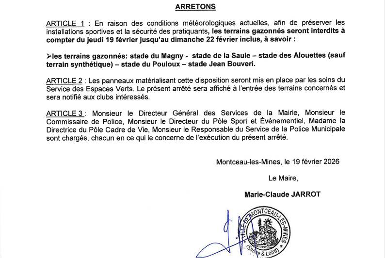 La ville de Montceau-les-Mines vient de prendre un arrêté, n°2026-074, portant sur l’interdiction d’accès à tous les terrains gazonnés de tous les équipements sportifs du jeudi 19 février 2026 jusqu’au dimanche 22 février 2026 inclus.